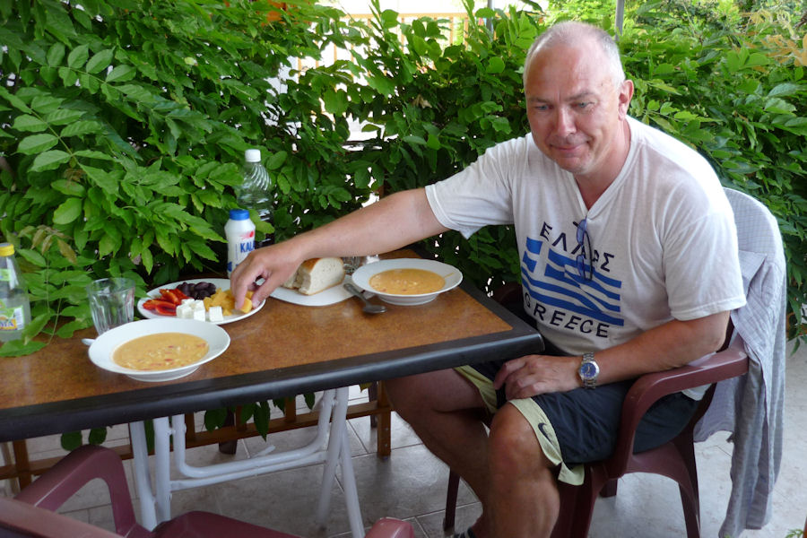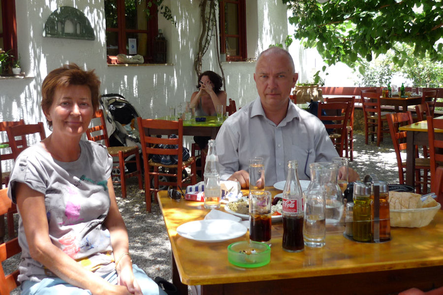 ![]() 38. Á veitingahúsinu í Anyðroi. Grískur strákpolli við næsta borð tók myndina. |