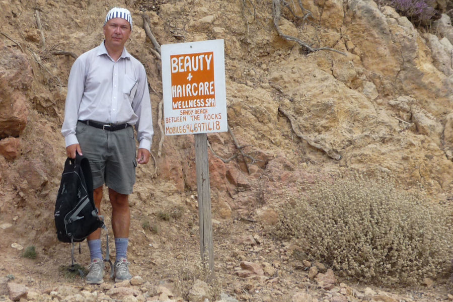 ![]() 34. Á leið til Anyðroi. Við ströndina var þetta athyglisverða skilti og spottakorn frá því þrír kofar á eyðiströnd. Í einum var selt kaffi. Merkingar gáfu til kynna að hinir væru snyrtistofa og nuddstofa en hvorki sáum við þar viðskiptavini né starfsfólk. |