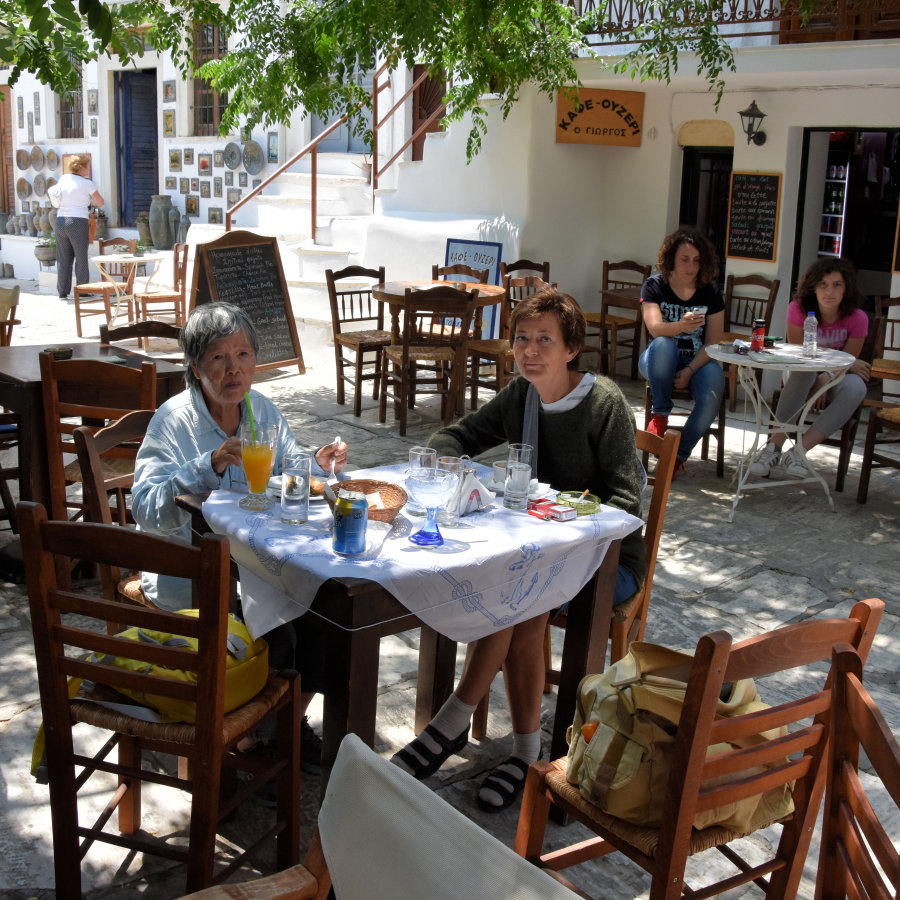 ![]() 12. Harpa og Bondí borða hádegismat í Apiranþos. Bondí er líffræðikennari frá Vietnam sem við hittum í dags ferð um eyna með rútu og leiðsögumanni. Hún er komin á eftirlaun og aflar fjár til ferðalaga með því að selja einkatíma í ensku. |