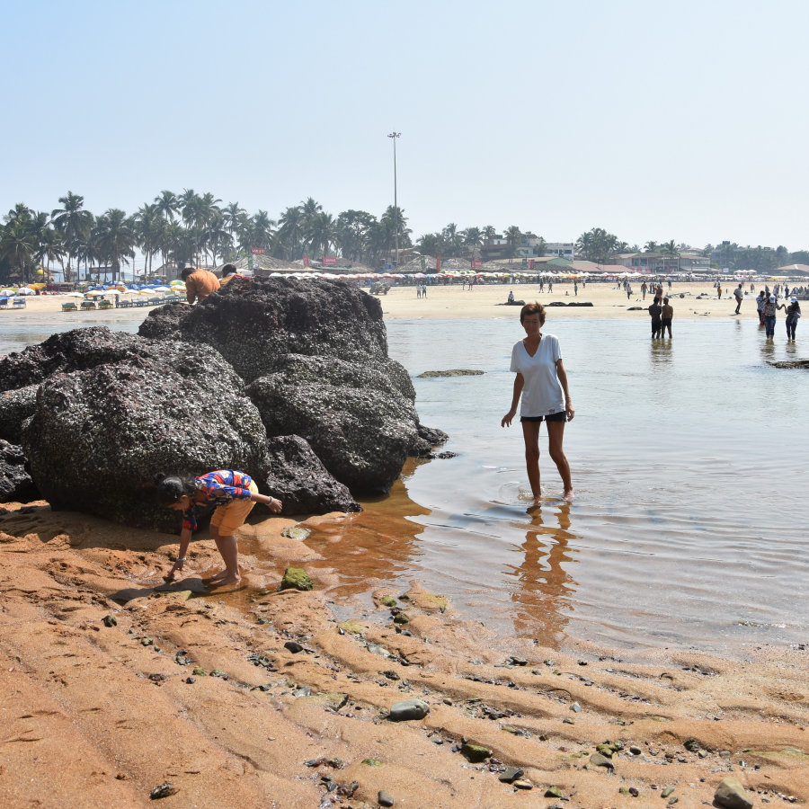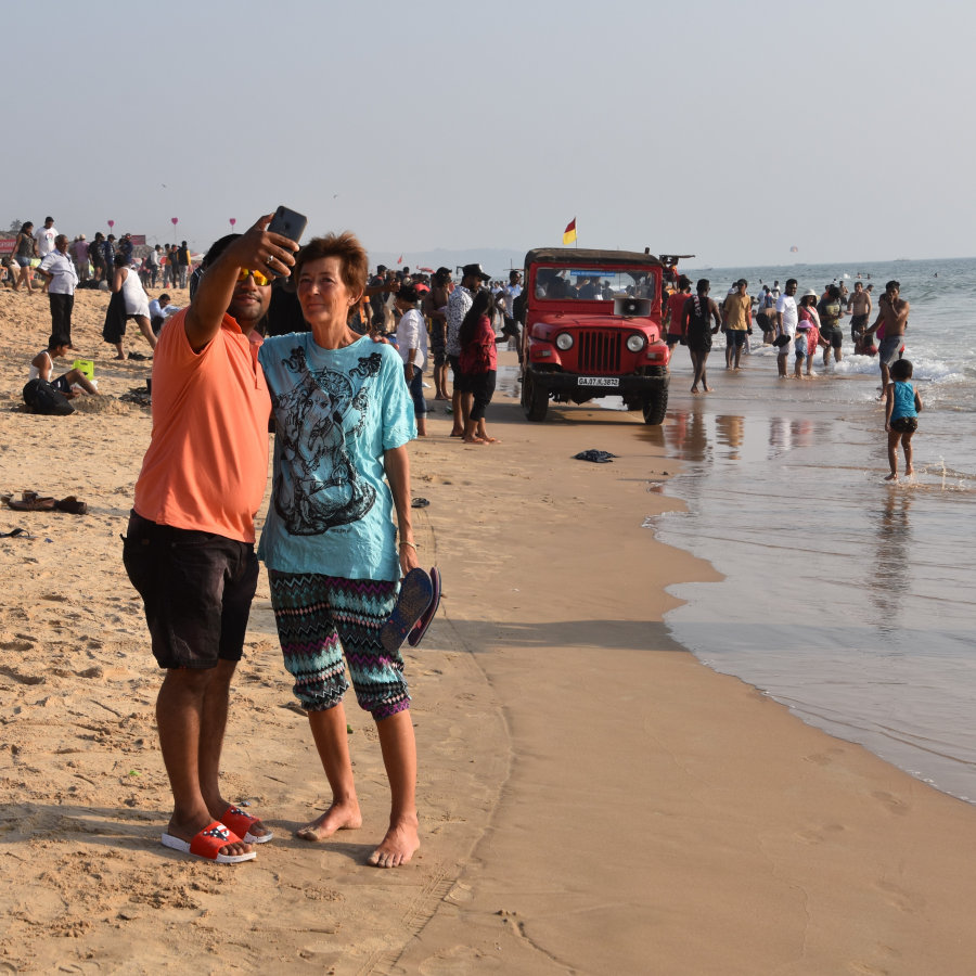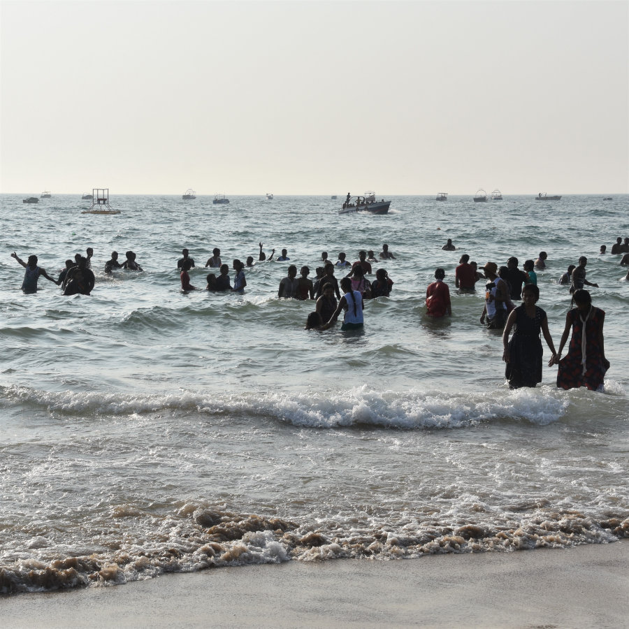 10. Líf og fjör á ströndinni í Calangute. Flestir ferðamenn á ströndinni voru Indverjar og þeir fóru margir í fötunum í sjóinn. |