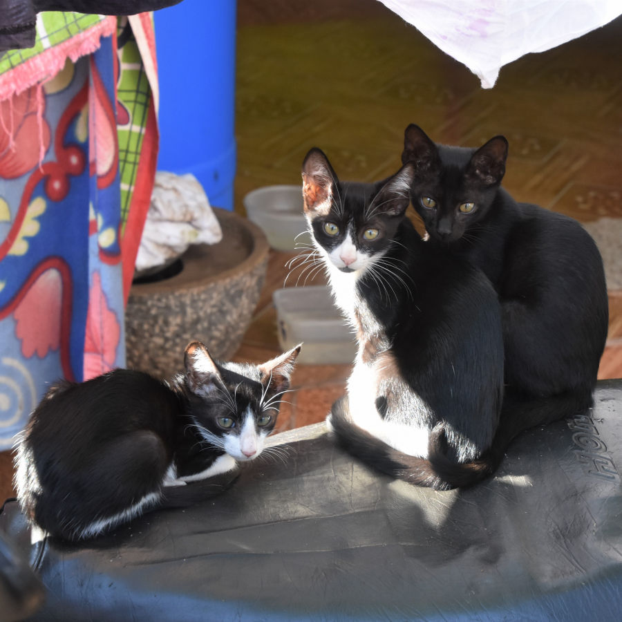 24. Þessir þrír áttu heima ásamt fólki og mörgum öðrum dýrum í húsi við afleggjarann að hótelinu (rétt hjá ávaxtasalanum á mynd 3). Þeir sitja á hnakk á skellinöðru. |